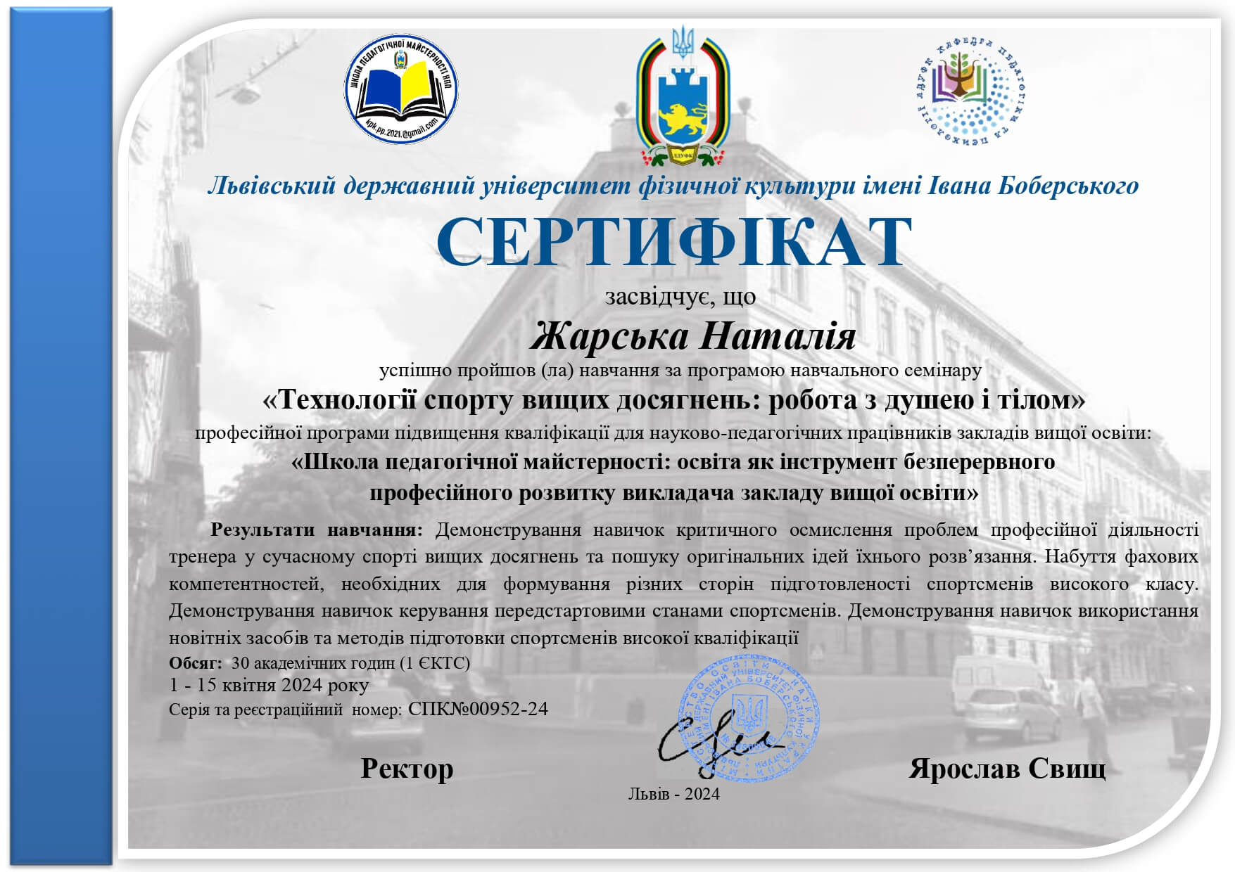 Посада – В.о. завідувача кафедри Науковий ступінь – кандидат наук з фізичного виховання і спорту Вчене звання – доцент Державні нагороди – «Подяка Львівської обласної державної адміністрації», «Подяка Міністра освіти і науки України»