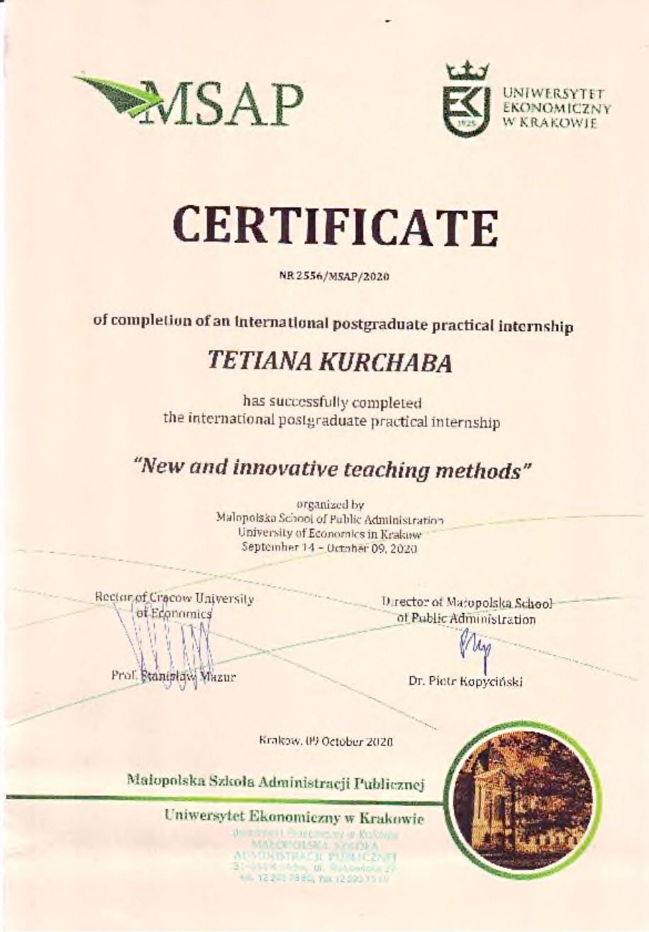 - Стажування Uniwersztet Ekonomicynzу w Krakowie 2020 рік, (Krakow, Republic of Poland);