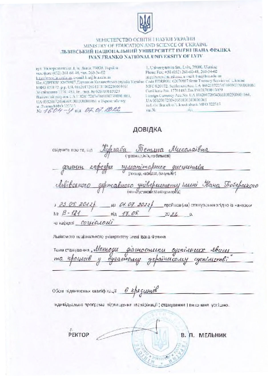 ЛНУ імені Івана Франка «Вдосконалення викладацької майстерності, з метою підвищення кваліфікації науково-педагогічних працівників», 09.05 – 28.06.2025р. (сертифікат 6 кредитів).