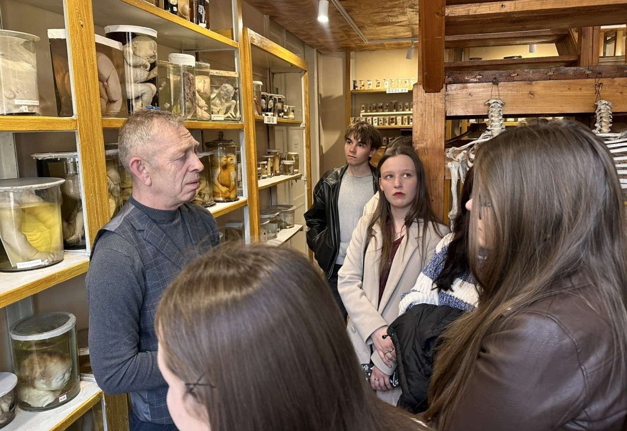 Екскурсійне заняття провів доктор, завідувач музею Володимир Федорович, який ознайомив студентів з унікальними експонатами та надав фахові пояснення щодо різних захворювань і патологій людського організму.
