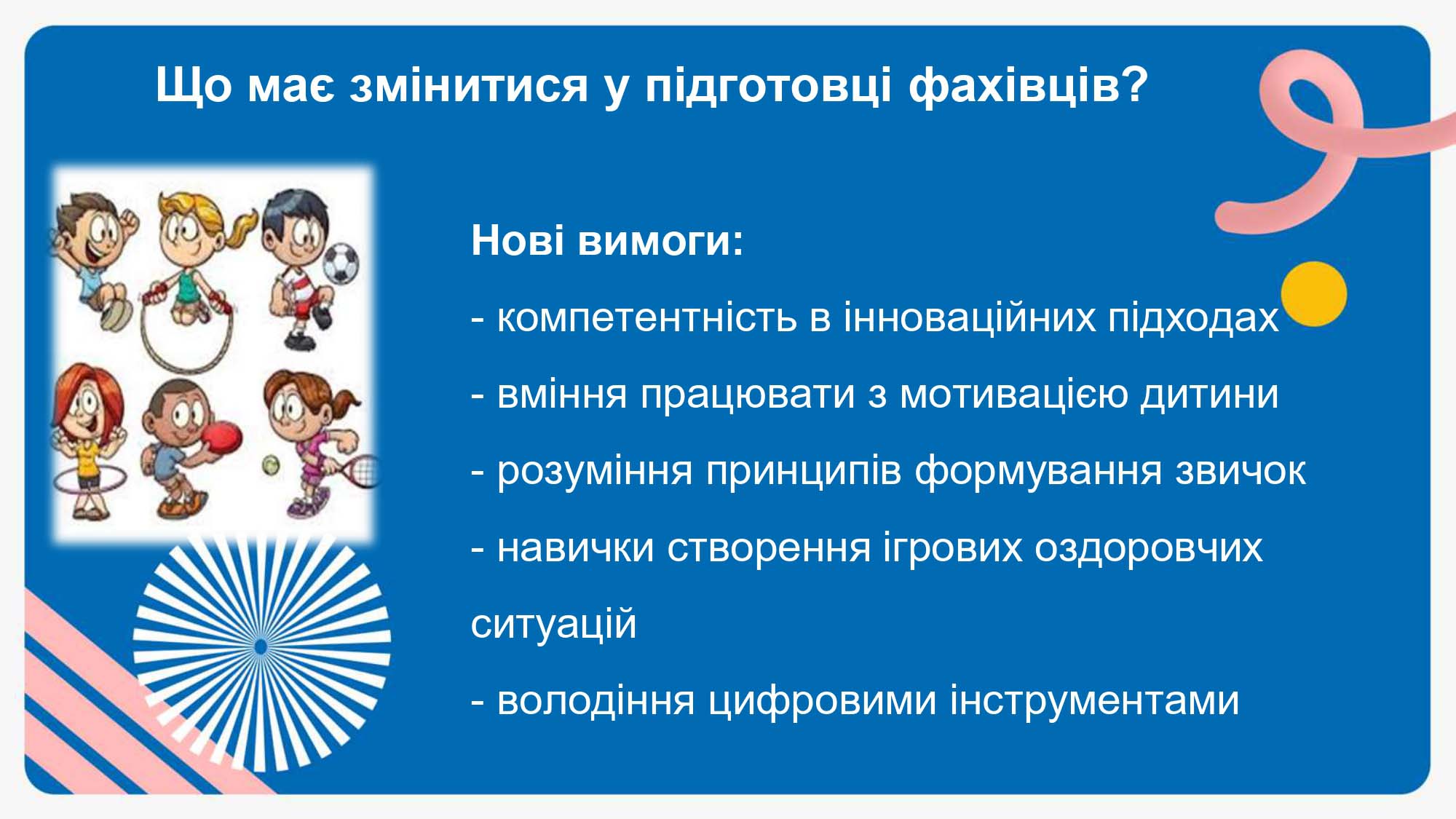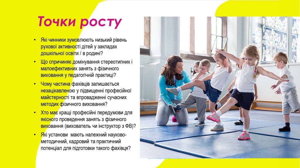 розповіла про те, як фізична культура може стати дієвим інструментом формування здорових звичок у дошкільників. Поділилася новими підходами – нейропедагогічними, ігровими та цифровими, які здатні зробити заняття по-справжньому ефективними. Наголосила на важливості оновлення освітніх програм підготовки майбутніх фахівців, щоб вони вміли формувати здорові звички у дошкільнят, а не просто проводити фізкультурні заняття.